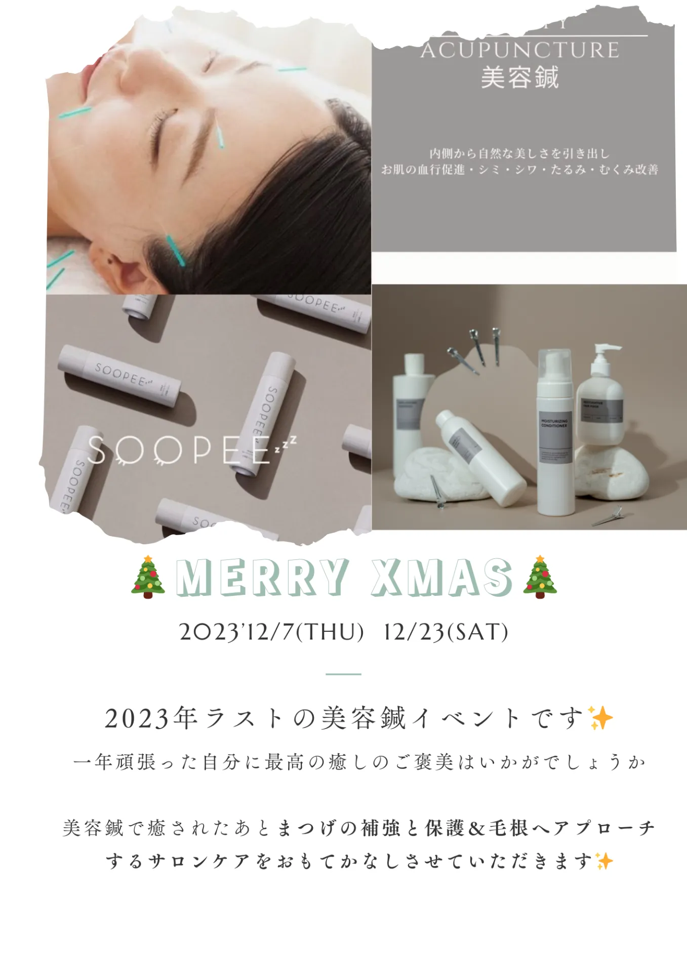 こんにちは(**)ノRoijiの鈴木です!当サイトをご覧いただきありがとうございます今年ラストの美容鍼イベントのお知らせです一年頑張った自分に最高の癒しのご褒美はいかがでしょうか()これまでも美容鍼の…